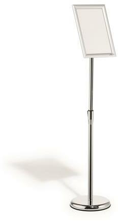 Gyorsan összeszerelhető információs állvány stabil DIN A4-es alumínium kerettel. -acél, alumínium, műanyag -ezüst színű -nagyobb stabilitás a talp homokkal való feltöltésével érhető el (átmérő: 250 mm) -gumigyűrűvel ellátott kerek talp, mely megakadályozza a padló karcolódását -fokozatosan állítható teleszkópos rúd, 770 mm-től 1205 mm magasságig állítható -