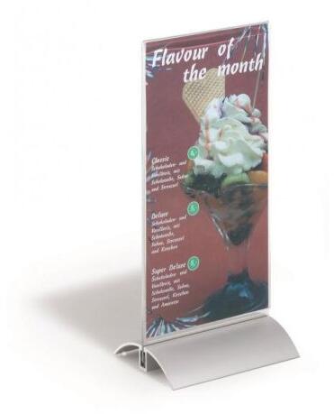 Bármilyen információ jó stabilitással történő bemutatására alkalmas állvány. A felső része kiváló minőségű átlátszó akril, az elegáns talp alumínium. Méretek: 107x237x85 mm