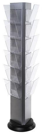 A4 formátumú forgó szórólap állvány. A fém lakkozott szerkezet fekete alapzattal nagy stabilitást biztosít a forgatásnál. A prospektus tartó zsebek egyenletesen vannak elosztva az állvány három oldalán. Mindegyik zseb mélysége 45 mm.