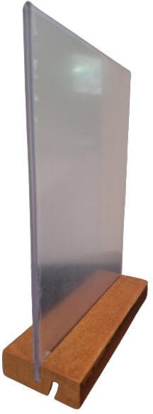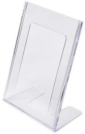 L alakú műanyag pultos prezentációs állványok. Alkalmas állványként éttermi menükre. Álló tájolás. Egyoldalas nézet.