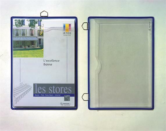 A4 méretű prospektustartó igénybevételt álló anyaga: tükröződésmentes PVC, műanyaggal bevont, acélhuzal kerettel az elején 2 cm vastag, merev zseb található a hátulján található zsebben, a táblában elhelyezett dokumentumok egy példányának tárolására van lehetőség fém füllelfüggeszthető a falra Kitűnően alkalmazható reklámanyagok, információs szórólapok, ka
