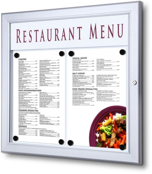 A kültéri zárható menüs kirakat kiváló megoldás az információk bemutatására vagy a fontos nyomtatott anyagok jól látható helyen történő megjelenítésére, nem csak az éttermek területén. Masszív alumínium konstrukciójának köszönhetően a vitrin kifejezetten kültéri használatra alkalmas. Nagyon ellenálló, nem csak a kedvezőtlen időjárásnak, hanem a mechanikai s