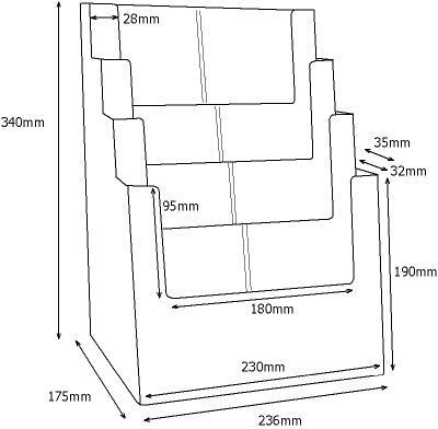 A4-es prospektusokhoz, 4 rekeszes. Belső méret: 228 x 185 x 31 mm.