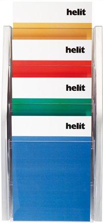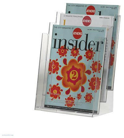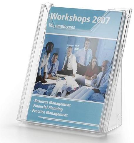 Áttetsző, műanyagből készült asztali és fali prospektustartó A/4-es anyagok számára. A lekerekített élek tiszta megjelenést sugallnak. .