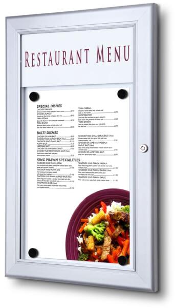 A kültéri zárható menüs kirakat kiváló megoldás az információk bemutatására vagy a fontos nyomtatott anyagok jól látható helyen történő megjelenítésére, nem csak az éttermek területén. Masszív alumínium konstrukciójának köszönhetően a vitrin kifejezetten kültéri használatra alkalmas. Nagyon ellenálló, nem csak a kedvezőtlen időjárásnak, hanem a mechanikai s