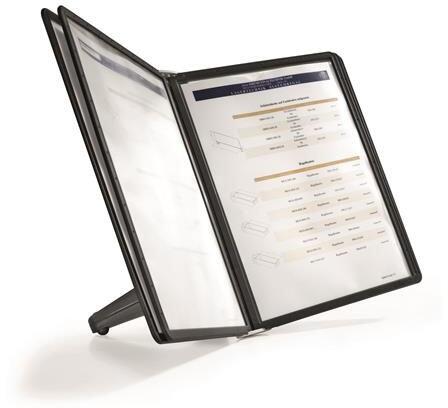 Teljes bemutatótáblatartó szett, asztali felhasználásra. -felhasználási terület: íróasztalok és irodai asztalokhoz -műanyag -fekete színű -álló tájolás -5 db A4 méretű SHERPA® panellel -stabil csúszásmentes asztali állvány -polipropilén panelek színes kerettel és tükröződésmentes, fénymásolható fóliával -az üres betétlapokkal ellátott indexfülek révén kö