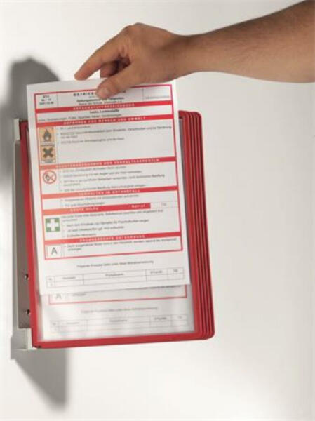 Bemutatótábla tartó, fali, 5 db bemutatótáblával, DURABLE VARIO® WALL 5, piros (DB555103) Teljes fali bemutatótáblatartó szett. -fém tartó -5 db A4 méretű SHERPA®, könnyen cserélhető panellel -polipropilén panelek színes kerettel és tükröződésmentes, fénymásolható fóliával -az indexfülek könnyen feliratozhatók -5 év garancia -külső méret: 360x325x260 mm (szé x