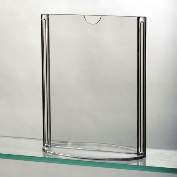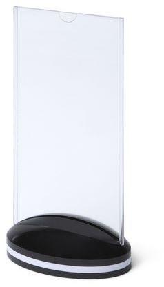 Műanyag pultos prezentációs állvány. Ellipszis alakú alapzat. Alkalmas állványként éttermi menükre. Az állvány alapkivitelben nyomat nélkül kerül szállításra.