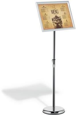 Gyorsan összeszerelhető állványos posztertábla stabil DIN A3-as alumínium kerettel, ezüst színben -felhasználási terület: vendéglátásban, kiskereskedelemben, múzeumokban, kiállításokon, vásárcsarnokokban, recepción, várótermekben és konferenciatermekben stb. -gumigyűrűvel ellátott kerek talp, mely megakadályozza a padló karcolódását -állítható olvasásái szög (