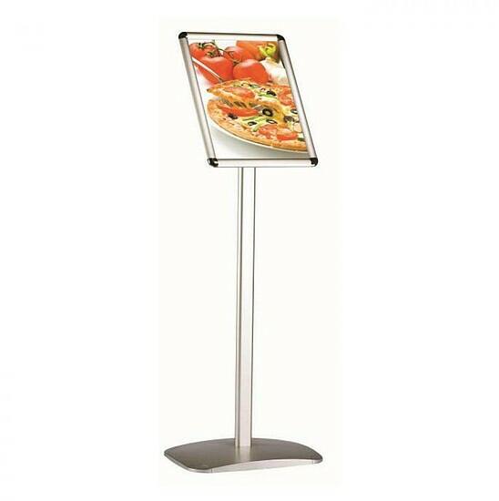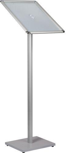 Dekoratív infóállvány, egy mozdulattal álló/fekvő pozícióba állítható alu keret+ alu szár+porszórt talp; Teljes magasság: Álló: 1200 mm, Fekvő: 1150 mm. Talp súlya: 2,7 kg, mérete: 300 x 420 mm. Csomagsúlya: 5,85 kg.