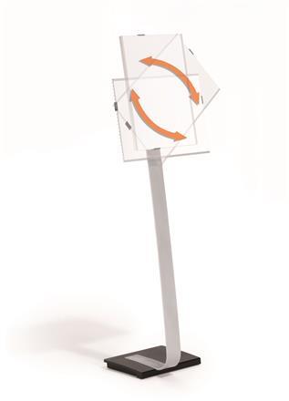 Alu padlóállvány A3, víztiszta akril előlappal. -felhasználási terület: recepciókon, vásárokon, előcsarnokokban és váróhelyiségekben információs állványként -egyszerű információcsere az akrillapok szétválasztása révén -formátum: álló/fekvő egyaránt -nehéz öntöttvas talpnak köszönhetően biztonságos és stabil -ergonomikus kialakítás: állítható magasság