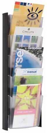 Prospektustartó modern designban A4-es dokumentumok bemutatására. -beltéri használatra -ideális a bejáratnál, kiállító helyeken elhelyezett tájékoztatókhoz -műanyag -álló A4-es dokumentumokhoz -fekete színben -bővíthető 6 kg teherbírásig -2 rekeszes -külső méret: 240x1115x135 mm (szé x ma x ho) -belső méret: 240x1115x24 mm (szé x ma x ho) Itt megtekinthető és letöl
