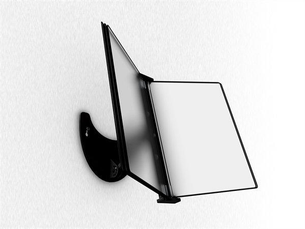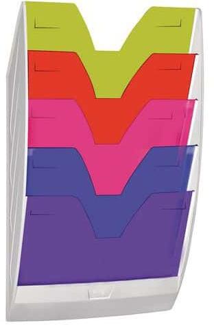 Mágneses fali állvány 5 iratrekesszel. Bármilyen sík fémfelületre felhelyezhető, így nincs szükség lyukak fúrására. Az állvány két erős mágnesnek köszönhetően akár 7 kg dokumentumot is elbír csúszás nélkül. Legfeljebb 24 x 32 cm méretű dokumentumokhoz használható.