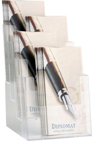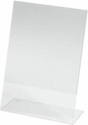 Állvány A5-ös formátumú, négy részből álló prospektusokhoz. Anyaga átlátszó átlátszó műanyag. Méretek (sz x ma x mé) 165 x 260 x 155 mm.