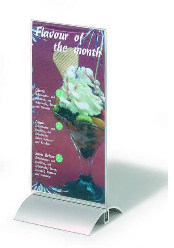 A prezentációs állványok egy panellel használhatók állványként étel- és itallapra vagy utazási irodák ajánlataira. Áttetsző akrilból készülnek stabilitást biztosító alumínium alapzattal.