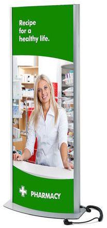 Kétoldalas információs oszlopok különböző formátumok bemutatására. Gyors és könnyű plakátcsere a behajtható kereteknek köszönhetően. A reklám jobb láthatósága a LED diódákkal való megvilágításnak köszönhetően a kereten. színhőmérséklet: 6 000 - 7 000 K