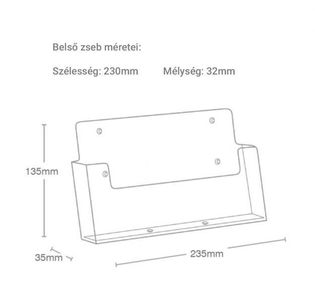 Fekvő A5-ös szórólapokhoz. Külső méret: 235 x 35 x 135 mm. Belső méret: 230 x 32 x 135 mm.