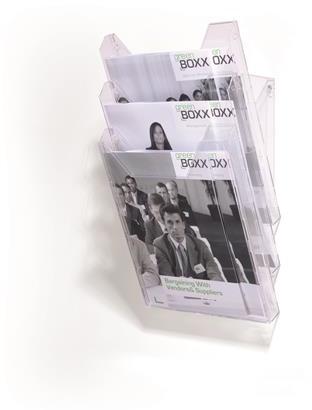 Prospektustartó A4-es méretű dokumentumokhoz asztali és fali kivitelben is. -beltéri használatra -ideális recepciós pultok, bemutatótermek vagy várótermek információs anyagaihoz -műanyag -álló A4-es dokumentumokhoz -áttetsző színben -bővíthető 6 kg teherbírásig -3 rekeszes -asztali állványként is és falra rögzített kivitelben is használható -külső méret:242x445x1