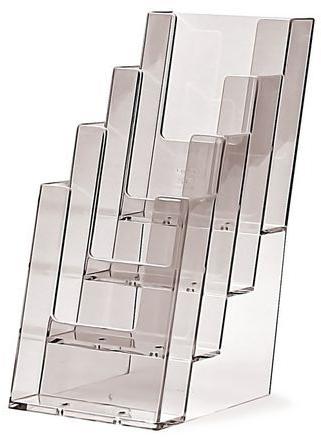 Plexi állvány szórólapokra, brosúrákra, reklámanyagokra stb. Négy zseb egymás mögött, álló tájolással. Az állvány alapkivitelben nyomat nélkül kerül szállításra.