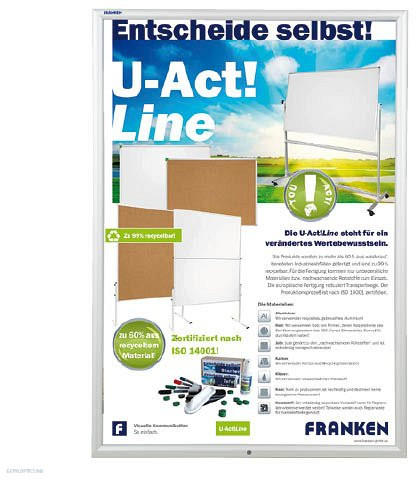 A Franken zárható kültéri képkeret elegáns, 35 mm széles ezüst eloxált alumínium keret tel kültéri használatra. Tükröződésmentes, UV-szűrős fóliával ellátva a tartalom védelme érdekében. Vízálló a beépített tömítőszalagnak köszönhetően. A keret biztonságosan zárható, a polisztirolból készült hátlap pedig megfelelő tartást biztosít. Külső méretek: 65