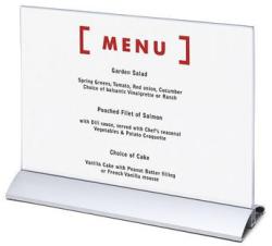 Műanyag pultos prezentációs állványok. Erős alumínium alapzat. Alkalmas állványként éttermi menükre. Fekvő tájolás. Az állvány alapkivitelben nyomat nélkül kerül szállításra.