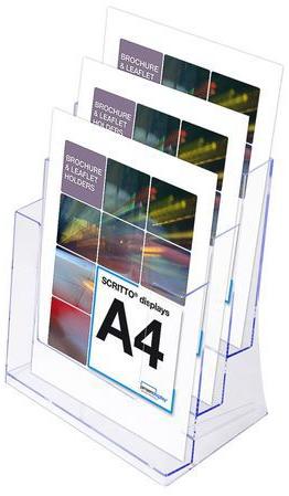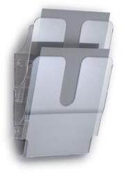 Műanyag szórólap, brosúra, reklámanyag stb. állványok. Három zseb egymás mögött, álló tájolással. Falra rögzíthető. Az állvány alapkivitelben nyomat nélkül kerül szállításra.