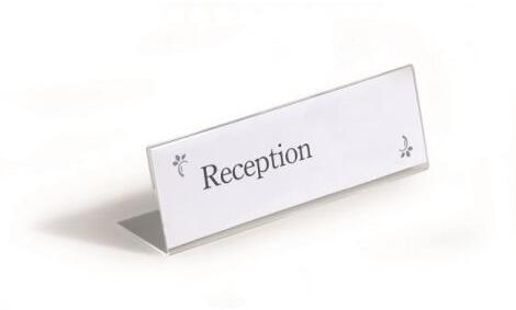 Stabil asztali névtábla "L" profil akrilból. Alkalmas konferenciákra, recepciókra, termékárakra és termékleírásokra. Nagyobb, 10 db-os csomag. Méretek: 61x210 mm