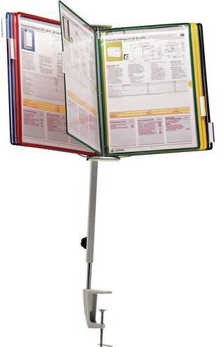 Állítható magasságú tartó információs táblák rögzítéséhez. A maximális kapacitás 10 tasak. A kar állítható hossza 48-70 cm. Rögzítés asztallaphoz bilincs segítségével, falra is rögzíthető fali tartóval (nem tartozék).