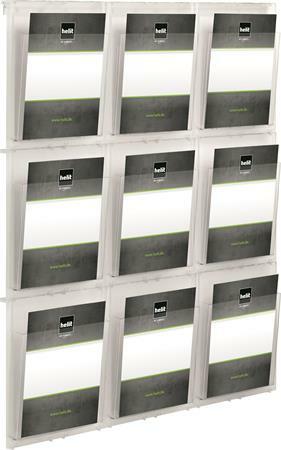 Alcsoport prospektustartó Méret A4 - fali prospektustartó 9 db A4-es rekesszel - alumínium sínnel (tartozék) - méretek: 852x978x59 mm - rekesz mélysége: 35 mm - törhetetlen alapanyag, elegáns, áttetsző fényes - könnyen falra szerelhető - függőlegesen bővíthető szélesség: 245 mm mélység: 35 mm magasság: 235 mm Gyártó/első EU forgalmazó elérhetősége: helit innovative