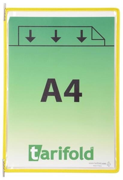 A bemutatótábla kiemelkedő minőségének köszönhetően flexibilis, strapabíró és rendkívül hatékony. A kétoldalú bemutatótábla a Tarifold tartókba tervezett prezentációs rendszerek részét képezi. A táblák műanyaggal bevont, acélhuzal kerete tartós és egyben rugalmas tartást eredményez. A tábla a fém forgócsapoknak köszönhetően a tartókba könnyen behelyezhető