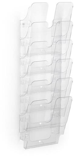 Prospektustartó modern designban. A4 méretű információk bemutatására. 6 db A4 álló részből áll. Méret: 745 x 247 x 100 mm (M x SZ x H)