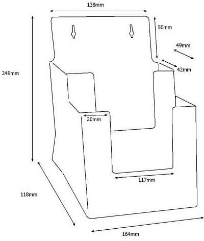 A5-ös prospektusokhoz, 2 rekeszes. Belső méret: 158 x 145 x 44 mm.