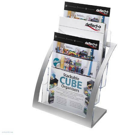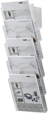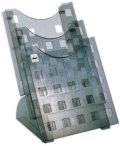 Áttetsző, műanyagből készült asztali prospektustartók A/4-es anyagok számára. A dokumentumok álló helyzetben helyezhetőek a tartó rekeszekbe. A lekerekített élek tiszta megjelenést sugallnak. A termék mérete: Szélesség 28,57 cm Mélység 17,62 cm Magasság: 33,81 cm .
