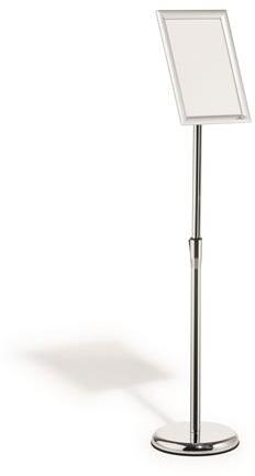 Gyorsan összeszerelhető információs állvány stabil DIN A4-es alumínium kerettel. -acél, alumínium, műanyag -ezüst színű -nagyobb stabilitás a talp homokkal való feltöltésével érhető el (átmérő: 250 mm) -gumigyűrűvel ellátott kerek talp, mely megakadályozza a padló karcolódását -fokozatosan állítható teleszkópos rúd, 770 mm-től 1205 mm magasságig állítható -