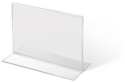 T alakú pultos prezentációs állványok plexiüvegből. Alkalmas állványként éttermi menükre. Fekvő tájolás. Kétoldalas nézet.