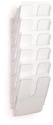 A műanyag univerzális prospektustartó 3 1/3 A4 formátumú rekesszel falra akasztható vagy asztalra állítható. További tárolók tetszés szerint csatlakoztathatók. A rekesz belső mélysége 2,5 cm.