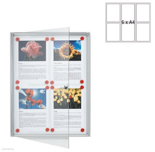 Belső felülete írható, szárazon törölhető, mágneses. Elegáns megjelenés, nagyon stabil eloxált alumínium kerettel és szürke műanyag sarokelemekkel. Az ajtó zárral ellátott plexiüvegből készül. Belső méret: 70 x 65,5 cm Külső méret: 73 x 68 x 3 cm 6 db A4-es lap fér el benne. .
