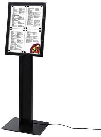 Zárható menüvitrin LED megvilágítással. Szabadon áll a saját fém alapzatán, elhelyezhető beltérbe vagy fedett kültérbe. Akár 4 A4 formátumú menü rögzítése mágnesekkel. Az elülső panel 0,75 mm vastag Lexan polikarbonátból készül. LED megvilágítás 5000 K színhőmérséklettel.