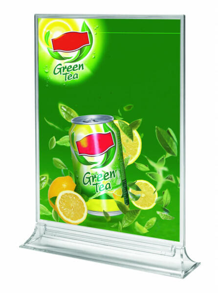 Műanyag pultos prezentációs állványok. Erős alumínium alapzat. Alkalmas állványként éttermi menükre. Álló tájolás. Az állvány alapkivitelben nyomat nélkül kerül szállításra.