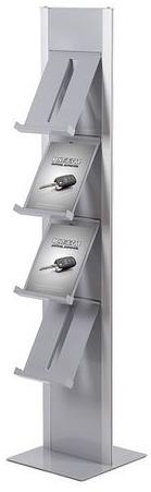 Moduláris állványok polcokkal A4 formátumú brosúrákra. A prospektus tartó fém polcok egyenletesen vannak elosztva az állvány elülső oldalán. A fogó lehetővé teszi a zsebek és brosúra tartók tetszőleges kombinálását. A kétszínű alumínium szerkezet nagy tartó stabilitást biztosít, az állvány oldalsó profiljai eloxáltak.