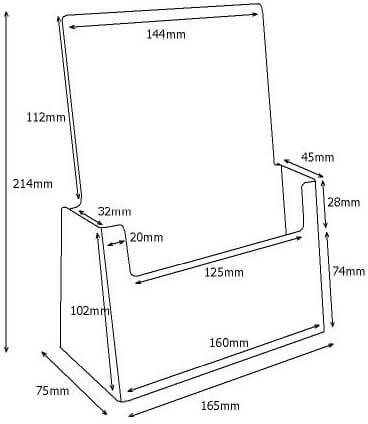 L alakú pultos prezentációs állványok plexiüvegből. Alkalmas állványként éttermi menükre. Álló tájolás. Egyoldalas nézet.