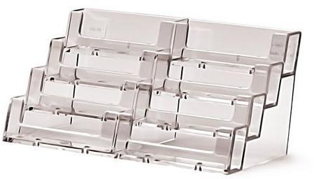 Plexiüvegből készült névjegykártya tároló. Lépcsős zsebelrendezés két sorban. Lehetővé teszi akár 8 kapcsolat bemutatását. Az állvány alapkivitelben nyomat nélkül kerül szállításra.