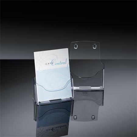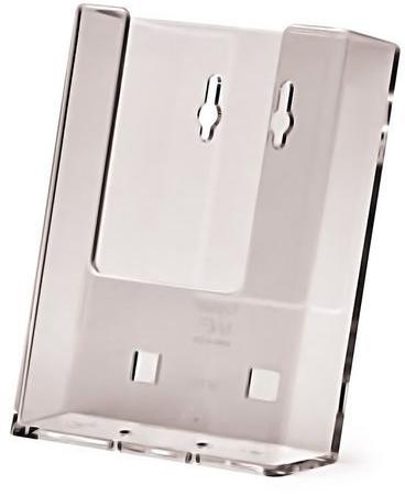 Plexi tartók szórólapokra, brosúrákra, reklámanyagokra stb. falra való rögzítéshez. Az asztali adapterrel a tartó asztalra állítható. Álló tájolás. A tároló alapkivitelben nyomat nélkül kerül szállításra.