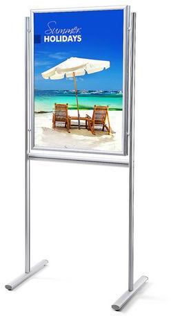 Kétoldalas információs állványok plakáttartó kerettel. Az alsó részben brosúra, katalógus és egyéb prospektus tartó pléh zseb helyezhető el. Plakáttartó hegyes élekkel és 25 mm profillal.