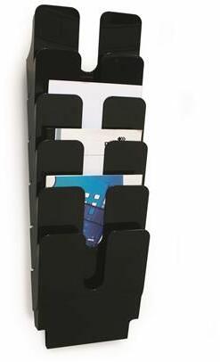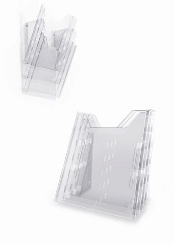 A műanyag univerzális prospektustartó 3 A4 formátumú rekesszel falra akasztható vagy asztalra állítható. További tárolók tetszés szerint csatlakoztathatók. A rekesz belső mélysége 2,5 cm.