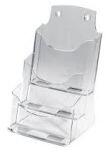 Asztali állvány három egyedi kialakítású, kiváló minőségű akrilból készült tálcával. Ideális brosúrákhoz, katalógusokhoz és szórólapokhoz. A polc mélysége 30 mm. 25 év garancia az UV sugárzásnak való ellenállásra. Méretek 175 × 290 × 150 mm. Színe tiszta.