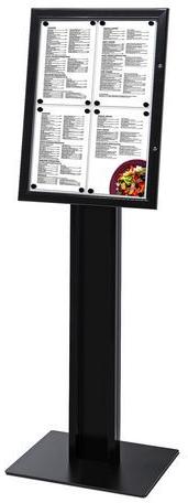 Zárható elegáns vitrin éttermi menü megjelenítéséhez. Szabadon áll a saját fém alapzatán, elhelyezhető beltérbe vagy fedett kültérbe. Akár 4 A4 formátumú menü rögzítése mágnesekkel. Az elülső panel 0,75 mm vastag Lexan polikarbonátból készül.