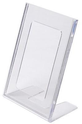 L alakú műanyag pultos prezentációs állványok. Alkalmas állványként éttermi menükre. Álló tájolás. Egyoldalas nézet.