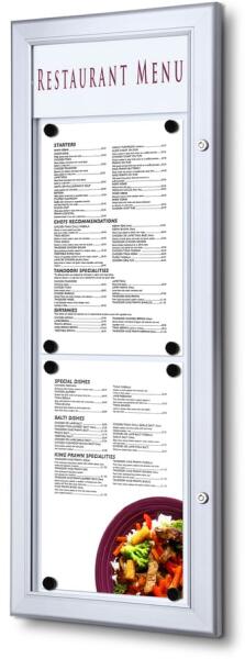 A kültéri zárható menüs kirakat kiváló megoldás az információk bemutatására vagy a fontos nyomtatott anyagok jól látható helyen történő megjelenítésére, nem csak az éttermek területén. Masszív alumínium konstrukciójának köszönhetően a vitrin kifejezetten kültéri használatra alkalmas. Nagyon ellenálló, nem csak a kedvezőtlen időjárásnak, hanem a mechanikai s