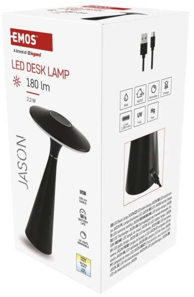 A legfontosabb paraméterekdimmelhetőségigenbeépíte tt tölthető elemigenszínfeketefényáram180 lmfény színemeleg/természetes/hideg fehérEgyéb paraméterekfogyasztás2,2 WUSB portigentápegység (tartozék)nemtápellátás típusaUSBtápegységUSBLED chipSMDtápkábel hossza1,5 mszínvisszaadási index (CRI)Ra >80öregedési tényező0,96védettségIP44anyagABS műanyagfeszültség3